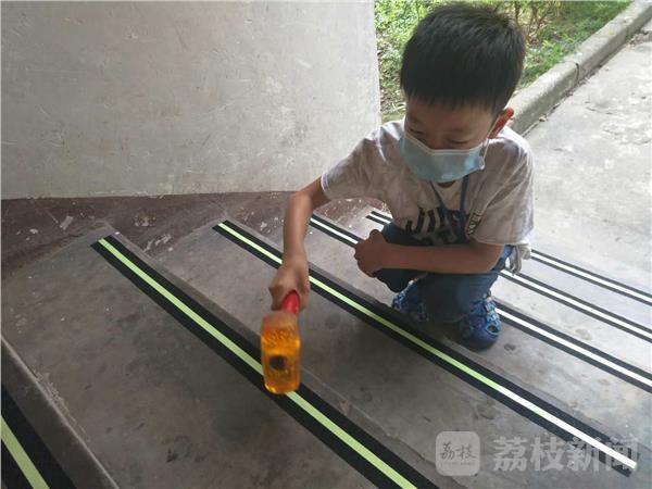 扬中市文化小区,是一个有着20多年历史的老小区,这几天,小区居民们惊喜地发现,原本黑漆漆的楼道里出现了一条条泛着绿色的光带,台阶的轮廓清晰可辨。居民奚先生既是受益者,也是这项活动的参与者: “因为是老小区,楼道经常出现用电故障,现在你看,没有灯,每级楼梯也是清清楚楚,而且这个反光材料它是防滑的。我们这是老小区,老年人多,作为我们年轻人也是积极参与了。”