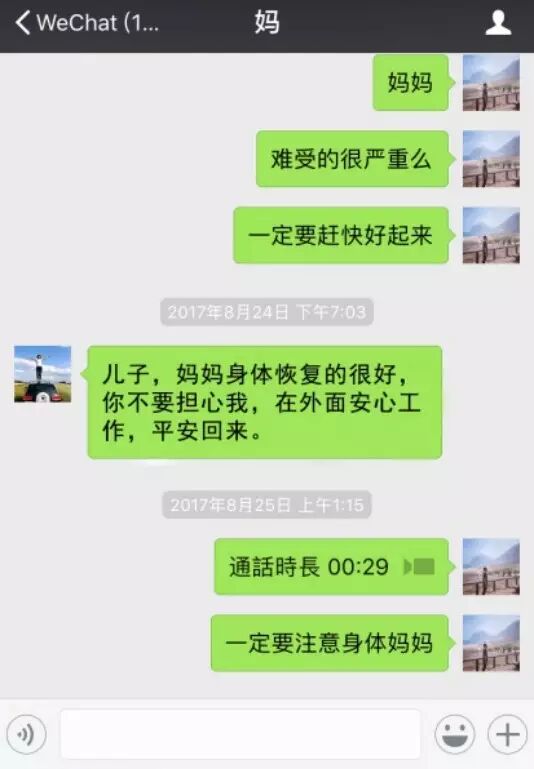 短短的29秒语音聊天中,尽管气息已经十分微弱,但王英帅的母亲仍旧安慰王英帅,让他好好工作。