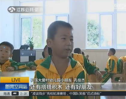 孔荡大爱村幼儿园小朋友孔俊杰:这是新的学校,还有滑滑梯,还有玩具,还有搭搭积木,还有好朋友。