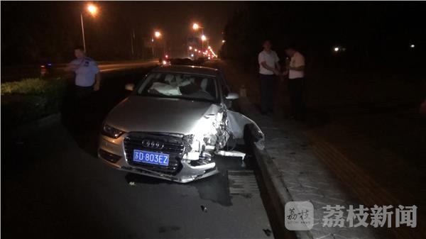 昨天(9月8日)晚上23点15分,在常州市钟楼区玉龙南路与水杉路右边,一辆由北向南直行的奥迪车,由左边冲向右边绿化带,撞断一根10米多高的路灯杆,冲过绿化带冲到右边慢车道,司机被路人救出昏昏沉沉,不知什么原因,路人报了120、110,交警到来时司机也醒了,疑似被气囊弹昏过去的,后被120急救车送常州医院检查。驾驶员李某称他是避让电动车造成的车祸。具体的事故原因还在调查当中。