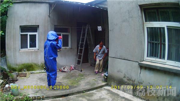 近日,南京市栖霞公安分局龙潭派出所民警在辖区走访时,水泥厂的一位居民郭大爷赶忙跑来向走访民警求助,他告诉民警家里屋檐上有一个大马蜂窝很吓人,自己每天进出门都心惊胆颤,恨不得买个头盔戴在头上。走访民警听完,随即跟郭大爷回家查看情况。