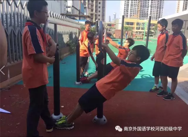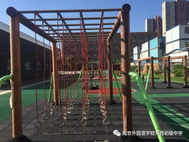 猿攀、灵敏跑、空中树林、横向攀爬……这些貌似在军队或拓展训练营才用到的一些道具被安装在了学校小操场上。据悉,这是南京外国语学校河西初级中学在开展与南师大、美国伊利诺伊大学、南京万德集团合作的实验课程:障碍跑。