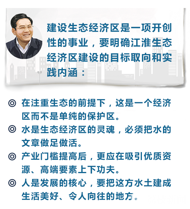李强指出,建设生态经济区是一项开创性的事业,怎么建、建成什么样,既要在规划编制中进一步深入研究、加以明确,更需要在实践中积极探索、蹚出路子。要明确江淮生态经济区建设的目标取向和实践内涵:第一,在注重生态的前提下,这是一个经济区而不是单纯的保护区。要以生态为前提和底色,更好地优化发展路径和模式,在集聚和提升上下功夫,聚焦重点产业,着力发展绿色产业和新经济,大力发展现代农业,深度挖掘旅游业,注重发展养老产业,建立负面清单和正面清单。第二,水是生态经济区的灵魂,必须把水的文章做足做活。通过水治理、水保护与水疏通着力打造好清水廊道,以湖为圆心建设绿色生态环,把这一区域湖群水网的水韵充分展现出来,构建江苏永续发展的“绿心”。第三,产业门槛提高后,更应在吸引优质资源、高端要素上下功夫。要按照满足需要、适度超前的原则,加快交通基础设施建设步伐,在充分发挥好开发区、集中区作用的基础上积极打造用好各类新的平台。第四,人是发展的核心,要把这方水土建成生活美好、令人向往的地方。把生态资源更好地转化成生态资本,实现人与自然的和谐共生,实现“生态越美丽—发展越兴旺—百姓越幸福”的良性循环。