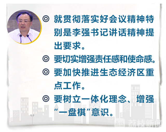 吴政隆就贯彻落实好会议精神特别是李强书记讲话精神提出要求。他强调,江淮生态经济区建设事关全省发展大局和长远,要切实增强责任感和使命感,把思想认识统一到省委、省政府决策部署上来,正确把握好生态保护与经济发展、“保一方水土”与“富一方百姓”、当前利益和长远发展的关系;要加快推进生态经济区重点工作,在加强生态环境保护、推动生态经济发展、构建精致宜人绿色城乡、打好富民增收主攻仗、强化政策支持保障等重点领域取得突破;要树立一体化理念、增强“一盘棋”意识,加強规划引领,鼓励先行先试,上下联动、左右协同,主动作为、积极作为,确保会议精神落到实处、见到实效,以优异成绩迎接党的十九大胜利召开。