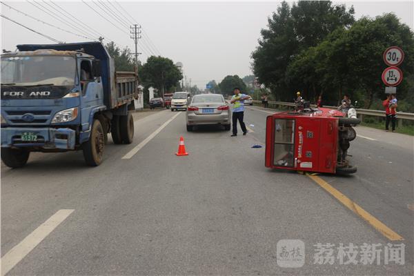 昨天(9月21日)15时48分许,在340省道句容市天王镇天金路路口,发生一起两车相撞交通事故,一辆封闭式电三轮从乡村小路(天金路)突然横穿340省道时,因驾驶人疏于观察,被340省道上直行的一辆小型轿车撞翻,事故造成两车受损约1.3万余元,电动车驾驶人头部外伤及5根肋骨骨折,幸好没有生命危险。接警后,句容交警大队天王中队民警立即赶到事发现场,及时将伤者送医院治疗。