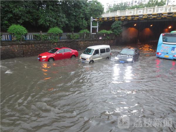 雨水直冲向道路,乘客只好站在快车道等车。水关桥涵洞又遭淹,汽车行驶中抛锚,还造成交通拥堵。