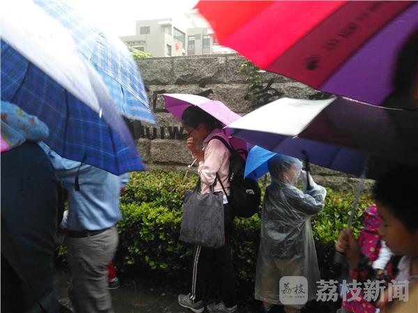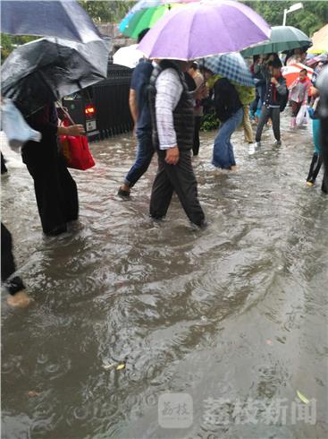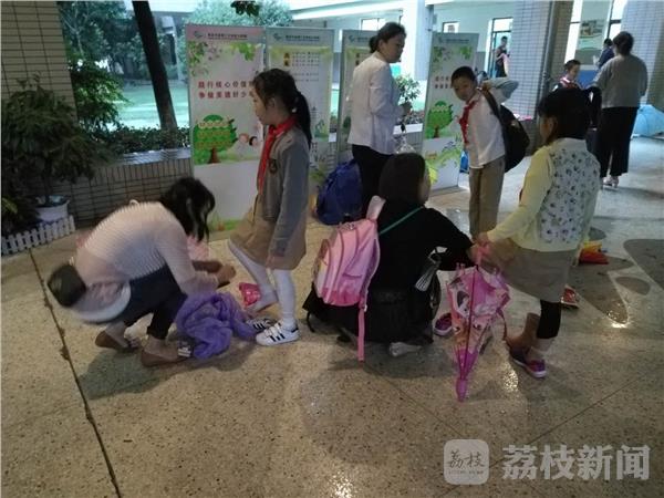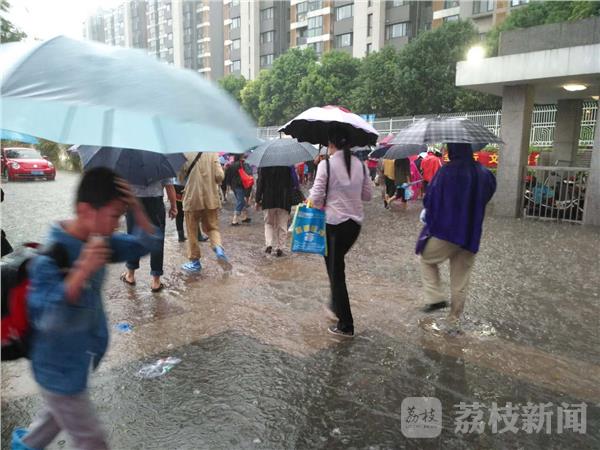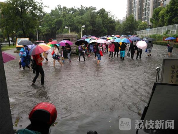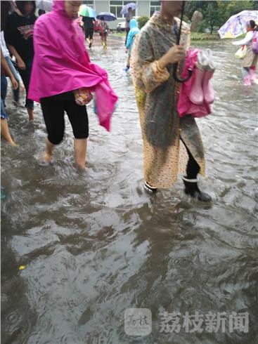 早上7点多钟,荔枝新闻记者途经位于南京河西的鼓楼区金陵汇文学校看到,校门口排水不畅,积水较多。记者脱下鞋子,行至水中,水深有20多公分。这个学校有小学生,也有中学生。记者看到,一些家长背着孩子趟过积水区,把小孩送进校园里。而一些大一点的学生,只能任鞋子泡在水中,涉水而过,鞋子湿了,裤脚也湿了。