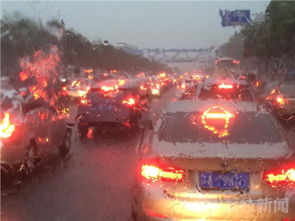 25日上午,暴雨袭击南京城,多地段路面积水。