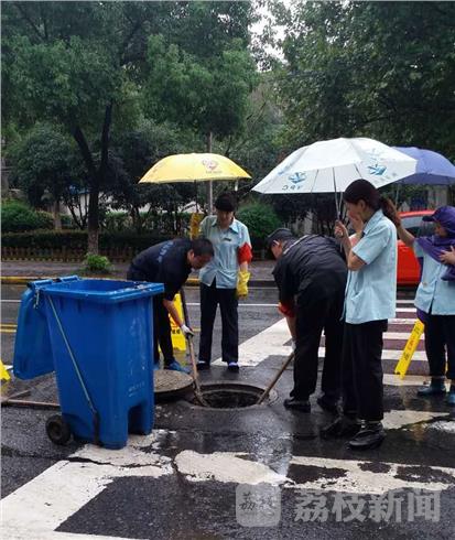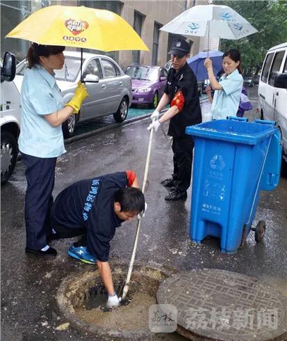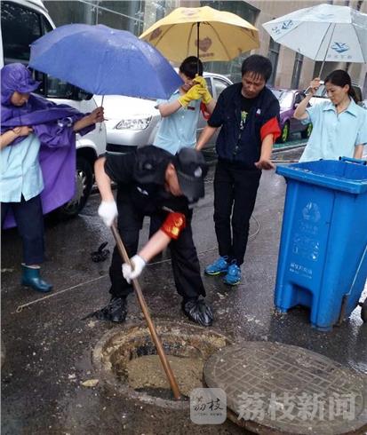服务于大厂文化馆的南京某物业王云子主任发现后,立即召集员工帮忙清理。由于窨井里面全是饭店流出来的油污,味道难闻,而且很难清理,保安和电工两位师傅不惧怕如何困难,甚至用手下去清理。虽然同事为他们打了一把伞,由于雨太大,身上还是淋湿了。小区居民看到后,劝他们等雨小了再来干,但他们看着路面流淌着的污水,怕再次伤害到市民,还是坚持清理干净。