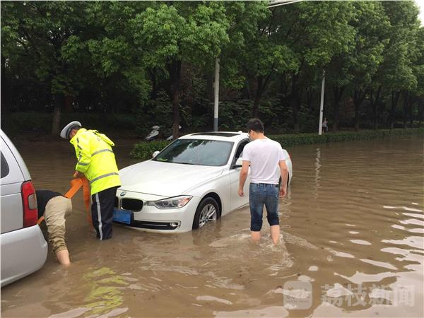 见此情况,民警立即安排警力在雨中提醒过往车辆绕行的同时,俯身淌水用牵引绳车拉车、徒手人推车等方式将所有抛锚车辆奋力移出积水区。