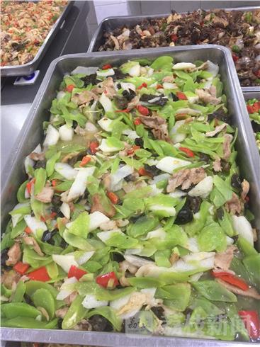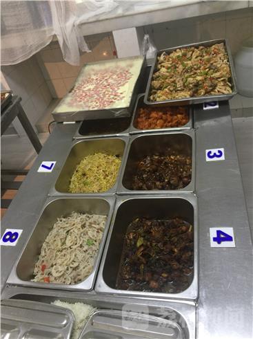 该校食堂共计7500平方米,分为三层。记者在现场看到,糖醋里脊、爆炒花甲、口水鸡、椒盐大排、剁椒鱼……十多个档口、近百种菜品,让人眼花缭乱。除此以外,学校在饭点还会提供各类中式、西式点心,共计60多个品种。