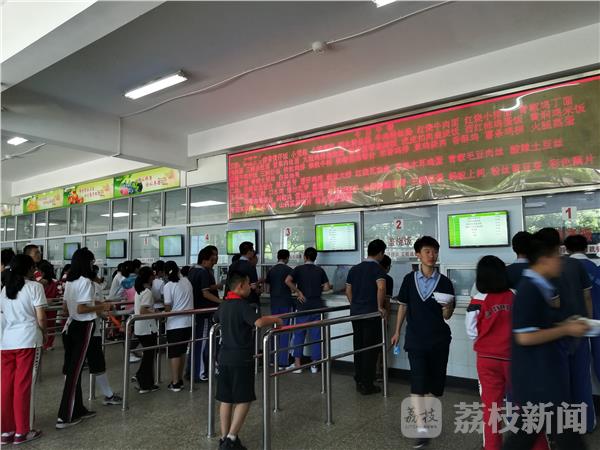 正值饭点,南京金陵中学河西分校的餐厅里人头攒动,校内的小学、初中、高中共计6000多名学生都在这里用餐。学生们表示,除了菜品丰富,价格也实惠,一大荤4块5,中荤3块5,小荤1块5,素菜1块,基本上10块钱就能吃饱吃好。