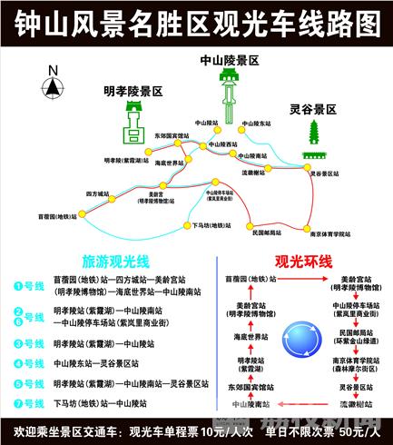 目前,中山陵风景区共有7条观光车线路,票价为10元/人/次,可以将游客从不同方向驳载到中山陵、明孝陵、灵谷寺、海底世界等主要景点。但是,这7条观光线并不能满足深度游游客的需求。为此,景区推出了观光环线。