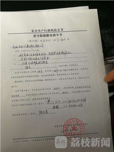 面对检查中发现的问题,检查人员已当场下发《责令限期整改指令书》。江苏省安监局监管一处处长乔勇表示:“你们企业要立即落实有关的要求,第二,对实际违法违规行为进行查处,一个星期内必须要到位,要有书面核查。大家齐心合力,把隐患消除掉,安安全全的生产,安安心心的挣钱。因为,如果看不到安全隐患,才是企业最大的隐患。”