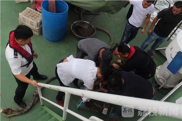接到求救报警,边防派出所迅速与渔政执法大队组织人员进行出海营救。边防警官王睿文告诉记者,他们接到报警后,就迅速与渔政和120急救中心取得了联系,带上急救医生一同出海,经过连续六、七个小时的快速航行,渔政船与渔船在海面上成功靠帮,将受伤的渔民转接到渔政船上后,渔政船随后加大马力,全速返航,而急救医生则对伤员进行了简单的治疗和包扎。