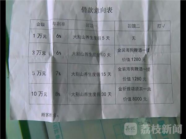 老人说就按照他手上的单子汇,工作人员看到单子上显示是一家保健品公司打着免费旅游的借款意向表,如果借1万,年利息6%,大别山养生5天;借3万,年利息6%,大别山养生10天,送价值1280元海狗鞭酒一盒;借5万,年利息7%,大别山养生15天,送价值1280元海狗鞭酒一盒;借10万,年利息8%,大别山养生1个月,送价值8000元的茶叶一盒。工作人员告诉老人这是骗人的,叫老人不要相信,但老人坚持要汇款,随后工作人员就报警并联系老人女儿刘女士。