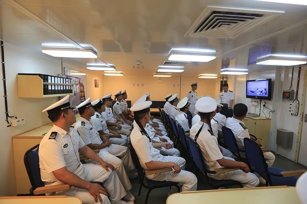 ▲编队官兵参观文莱海军舰艇并观看该舰介绍片