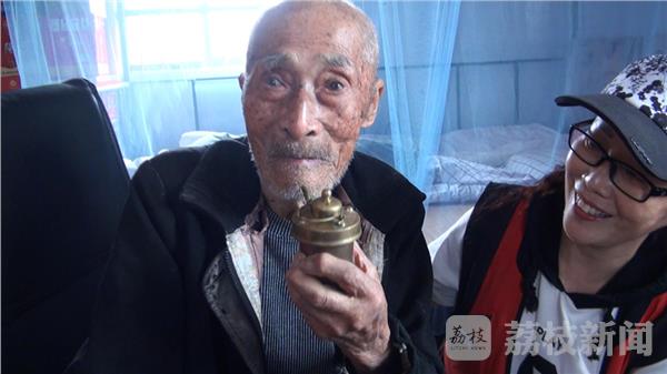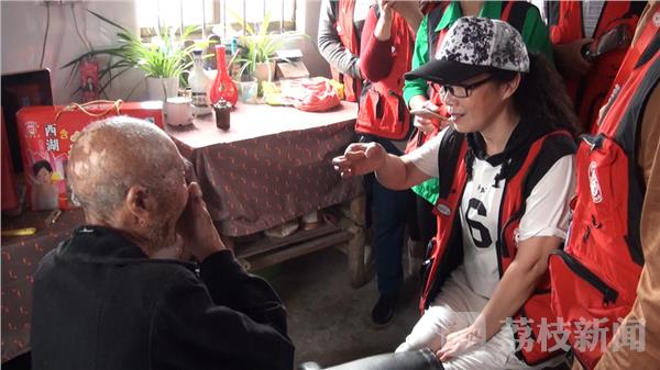 看到有爱心人士前来探望他,老人虽然口齿不太清晰,但依稀可以听出来“谢谢、百岁”的话语来,也可以感觉到老人很高兴。得知志愿者想和他拍照留念,老人不用搀扶,自己走出房间,与前来探望他的志愿者们合影。