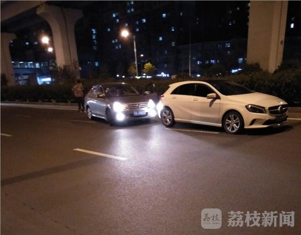 19:00左右正是南京江北大道车辆通行高峰,由六合往南京方向过来的车辆逐渐在该匝道口汇流。灰色轿车司机在变道时与白色奔驰轿车差点发生碰擦。随即,两人发生口头争执,并将车停在路中央。