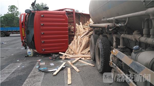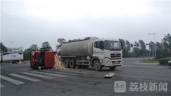 今天,9点30号上午九点五十左右在扬州扬子南路与春江路交叉口,一辆货车与一辆槽罐车相撞,导致货车侧翻,一车木材侧翻,其中货车中一人受伤。