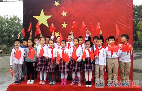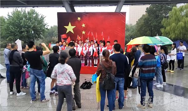 10月1日是祖国生日,江苏淮安钵池山风景区西门天桥下,淮师一附小18名小学生与家长正在举行唱国歌祝福祖国活动。
