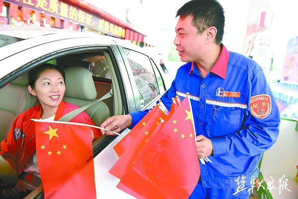 △10月1日,中石化青年路加油站向加油的客户赠送国旗。盐阜大众报报业集团全媒体记者 张一轩 摄