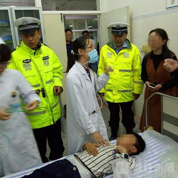 “救人要紧!”唐忠立即提出要求,一边安排人员联系 120 救护车,另一边防止高速上堵车,安排警车开道。不久 120 赶来,进行了简单处理后,警车一路在高速上为 120 开道,下了高速后又一路飞速行驶,直到安全抵达医院。民警王岩告诉记者,本来半个多小的路程,花了近 20 分钟将男孩送到了射阳县人民医院。