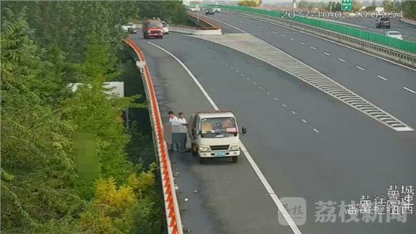 当天下午16时许,戴秋阳在视频监控中发现一辆白色的轻型货车停在了盐徐高速潘黄枢纽处的应急车道内,一名男子下车走到了路边“方便”,不一会儿,坐在副驾驶的乘客也紧接着下车“方便”,通过视频监控可以发现,车辆在应急车道上停留了几分钟的时间,两人在方便完后,又对车厢的物品进行了整理,而车后一直没有放置警示标志。正当两人上车准备驶离的时候,后方驶来一辆小型轿车,也许是因为看到了这一情况,轿车驾驶员竟然也将车停在同一地点的应急车道内下车“方便”。