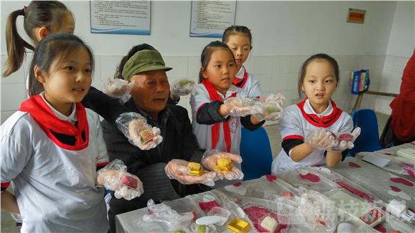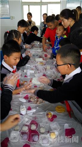 志愿者们一到敬老院就开始包月饼了,别看月饼圆圆的一块,可是里面的学问大着呢,现场和面的和面,和馅的和馅,包月饼的同时,小志愿者们还将节日慰问品分发给五保老人手中。