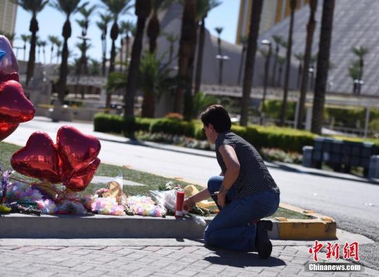 10月3日,位于拉斯维加斯市中心的事发区域依然严密封锁。在现场警戒线内侧,摆放着民众送来的鲜花和气球、蜡烛等。图为一位拉斯维加斯居民前来向遇难者献花致哀。 中新社记者 张朔 摄