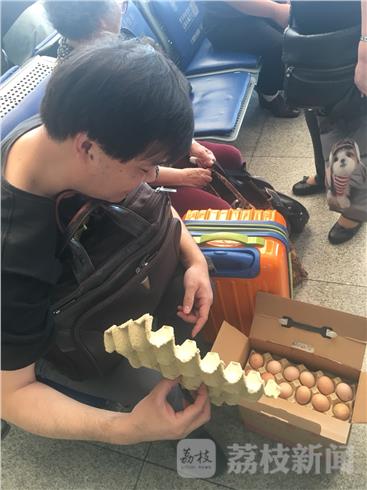 盐水鸭、鸡蛋、土鸡、水果、菱角、糕点、大闸蟹,打开候车旅客的行囊,里面塞满了各种五花八门的家乡美食。