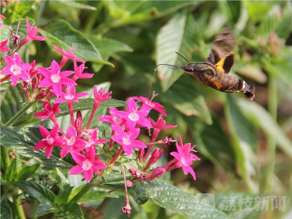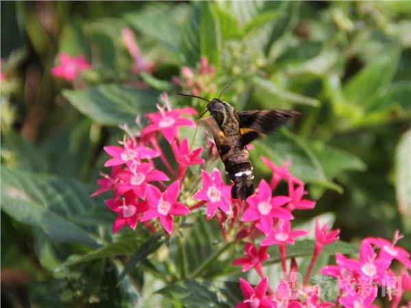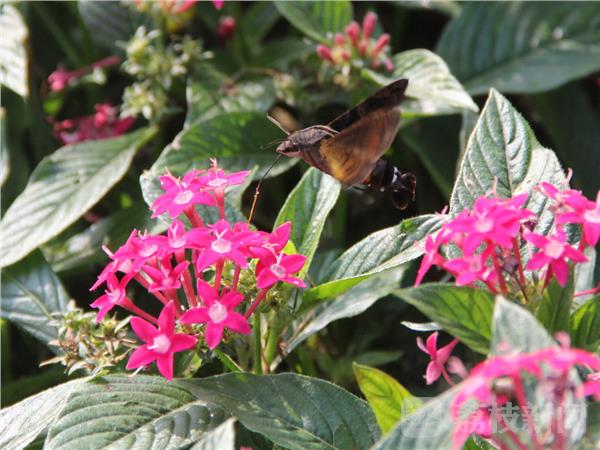 今天(10月8日)下午,在南京市新街口西安广场花园內,在繁星花上有许多只身形奇特的飞蛾,原来这是被称为昆虫世界里“四不像”的蜂鸟鹰蛾。据悉,蜂鸟鹰蛾是产于美国的稀有昆虫,在中国国内较为罕见。所谓蜂鸟鹰蛾“四不像”是指它首先像蝴蝶,有长长的喙管和触角;它又像蜜蜂,能发出清晰可闻的嗡嗡声;它还像南美洲的蜂鸟,夜伏昼出,取食时和蜂鸟一样,其实它属蛾类。和蜂不同的是,它采花不携粉,采蜜不酿蜜,能原地悬空取食;和鸟不同的是,它盘旋飞翔时既能前进也能后退。