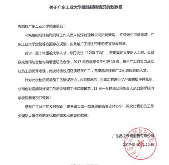 近日,广东工业大学学生在网络发布消息称,广州苏宁易购HR在该校校招时涉嫌歧视,称管培生只要985/211高校学生,致使部分学生只能面试经理岗。该公司已在微博上发布致歉函,称涉事人员已被免职。校方称,广州苏宁相关负责人已到该校致歉。
