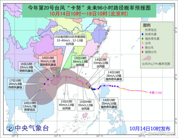 今年第20号台风“卡努”(强热带风暴级)的中心今天(14日)上午10点钟距离海南文昌大约810公里(北纬17.5度、东经118.2度),10级(25米/秒),985百帕,七级风圈半径150-350公里,十级风圈半径60-80公里。