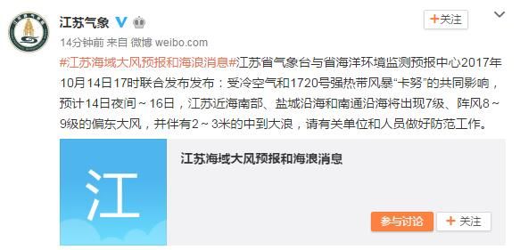 荔枝新闻讯 台风来啦!请注意!江苏省气象台与省海洋环境监测预报中心2017年10月14日17时联合发布发布:受冷空气和1720号强热带风暴“卡努”的共同影响,预计14日夜间~16日,江苏近海南部、盐城沿海和南通沿海将出现7级、阵风8~9级的偏东大风,并伴有2~3米的中到大浪,请有关单位和人员做好防范工作。