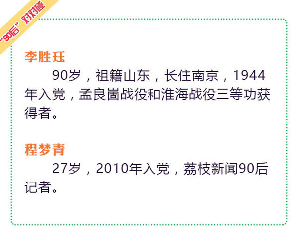 今天的“90后”对对碰,我们选择的是一位南京的老党员李胜珏,今年90岁,中国船舶重工集团公司第七二四研究所原副所长,也是孟良崮战役和淮海战役三等功获得者,他还有一个特殊的身份,正好是本篇采访小编的外公。平日里,外公于我是慈祥、爱开玩笑的老顽童。今天,外公是一位老党员、老八路、老干部。而小编也不再仅仅扮演一个外孙女的角色,更是以一个年轻党员、一个记者的身份,好好听外公说一说过去的那段峥嵘岁月。