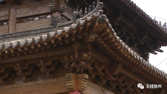 拾级而上,抬头看去,在屋檐下是层层叠叠的斗拱,现在已经很难在建筑上看到如此大规模地使用斗拱,而这座祠堂的整个上层建筑完全是由这一个个大大小小的斗拱来实现支撑。整个建筑完全是木质结构,利用古代建筑技术进行建造,另外使用了少量的石材。完全没有钢筋水泥,祠堂共有32根木质立柱进行支撑,而且这些柱子还使用了独有的建设技术。空气可以在里面循环,防虫防潮。