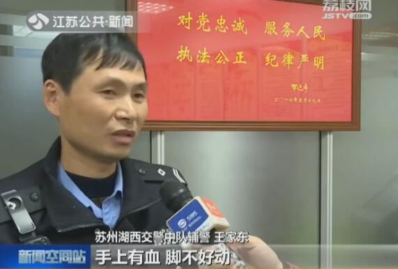 上午七点左右,辅警王家东正在苏州中新大道星港街路口指挥交通。这时,一辆电瓶车和汽车发生了碰擦,电瓶车主摔倒在地,情况危急。