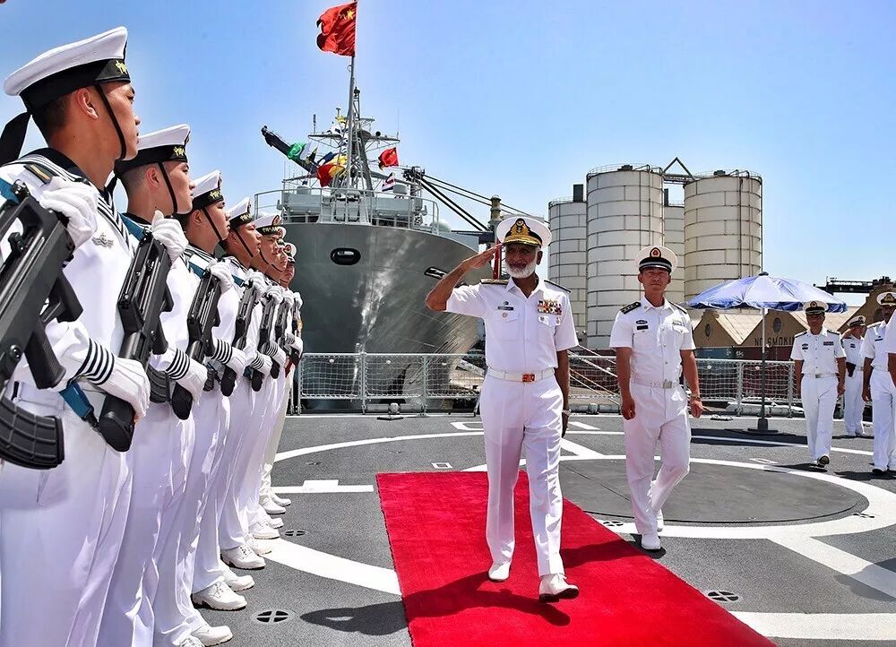 ▲巴基斯坦海军参谋长扎考拉上将检阅编队仪仗队