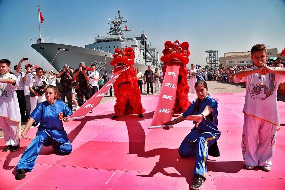 ▲希腊民众用中国传统舞狮表演欢迎编队到来