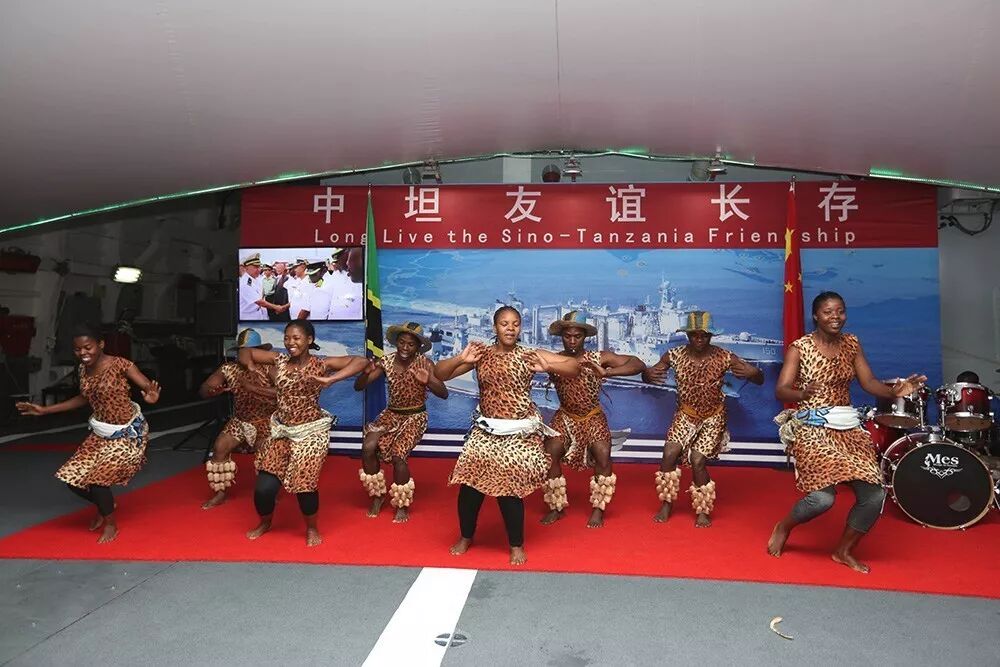 ▲坦桑尼亚军队文工团在我甲板招待会上表演民族舞蹈