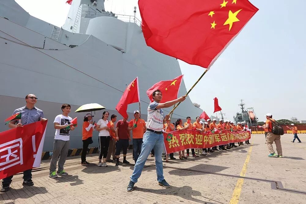 ▲访问编队抵达孟加拉,当地华人华侨到码头热烈欢迎