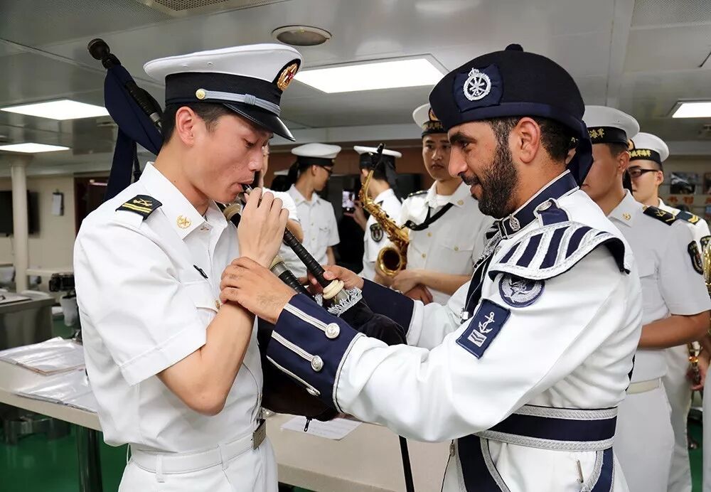 ▲阿曼海军军乐队登舰参观并与长春舰战士军乐队进行专业交流