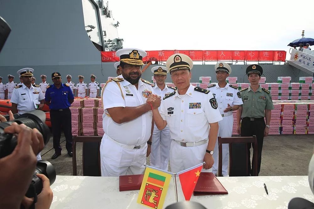 ▲编队指挥员沈浩、斯里兰卡海军司令维杰古纳拉特中将在我编队捐赠物资清单上签字后亲切握手