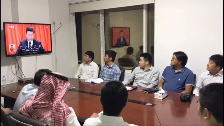在沙特首都利雅得,扬州邗建集团海外部员工集中收看十九大开幕大会直播,十九大开幕时间已是当地时间凌晨4点,但大家依然心情激动,对习总书记报告中描述的祖国五年来的发展成就,大家深感骄傲和自豪,表示会在海外做出更好的成绩,为国争光。