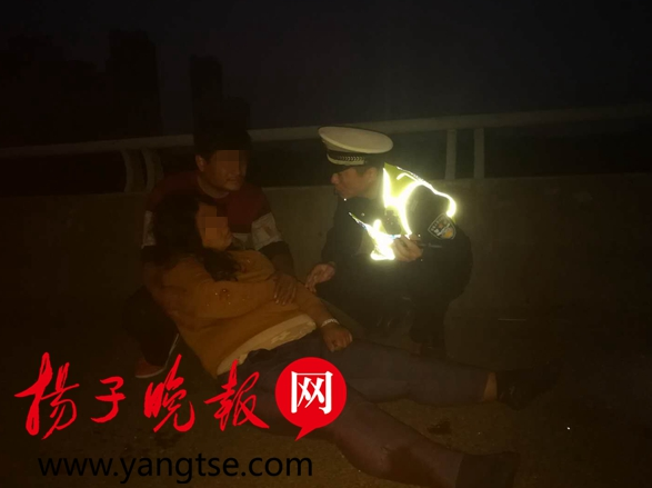 10月21日傍晚5时38分,镇江交警高速二大队接到报警,往溧阳方向25公里处有人在路上拦车。由于天色渐黑,过往车辆避让时险象环生。大队立即指令民警叶迁带领辅警张国文出警,民警赶到现场时,发现一男子正抱着一妇女,坐在应急车道哭泣,且车后没有设置警示标志。