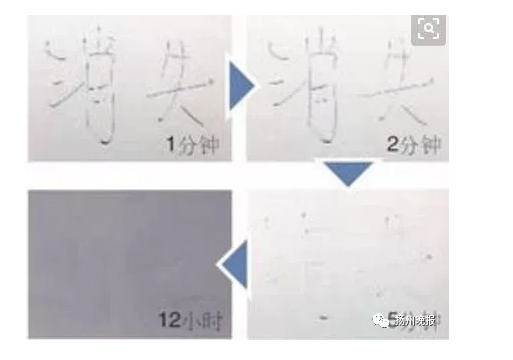 其实,这种笔芯没有什么神奇之处,其原理非常简单:利用墨水的显色因子与空气中的氧发生反应,使之消色。这类笔写出来的字迹,会根据材质、温度、湿度、书写速度等差异而在15分钟至2日内自然消失。