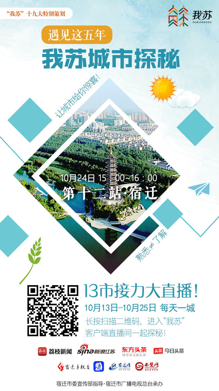 遇见这五年,小苏有话说~由“我苏网”、“我苏”新闻客户端发起,全省13市市委宣传部指导,逾百家媒体共同助力的“遇见这五年·我苏城市探秘”大型接力直播即将于24日下午3点迎来第十二站—— 宿迁。
