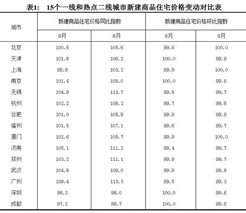 9月份,15个一线和热点二线城市新建商品住宅价格变动对比表。来源:国家统计局官网