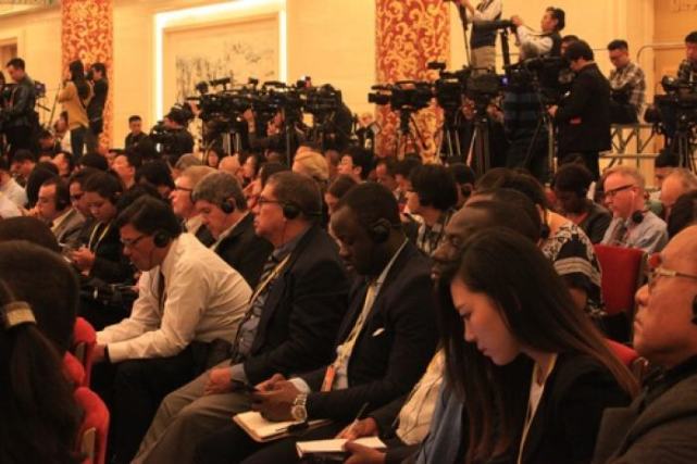 10月17日下午,外国记者在认真聆听新闻发布会。(徐豪 摄)